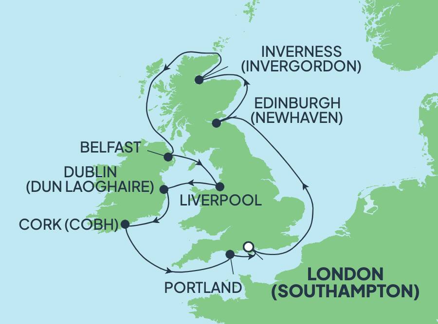 Descubre lo mejor del Reino Unido e Irlanda en este crucero de ida y vuelta desde Southampton. Descubre la inigualable belleza del paisaje y la fascinante historia de las tierras altas escocesas que rodean Invergordon y visita la famosa región del Lago Ness. Los fanáticos de los Beatles estarán encantados al hacer una parada en Liverpool en Beatles Story, una amplia exhibición dedicada a los Fab Four, y una visita a The Cavern Club, donde la banda  se abrió camino hacia el estrellato. Luego, viaja desde Dun Laoghaire a Dublín, donde podrás saborear lo mejor de esta encantadora ciudad en restaurantes con estrellas Michelin y conocer desde castillos históricos hasta museos de primer nivel.
