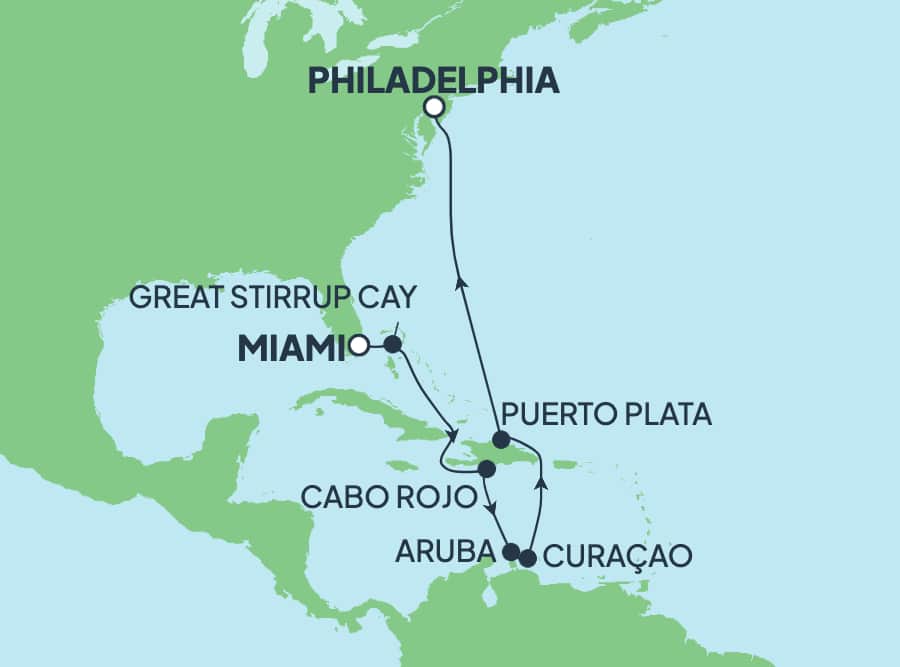 Descubre la vibrante belleza del Caribe en unas vacaciones de 10 días bajo el sol. Bebe un trago helado y relájate en tu cabaña privada en la playa en Great Stirrup Cay, nuestro paraíso tropical justo para ti. En Oranjestad, Aruba, disfruta del encanto europeo-caribeño a lo largo de vibrantes avenidas o encuentra la calma en las grutas solitarias. Pasea por las coloridas calles de Willemstad, Curazao, admirando la arquitectura de inspiración holandesa y los concurridos mercados llenos de tesoros locales.