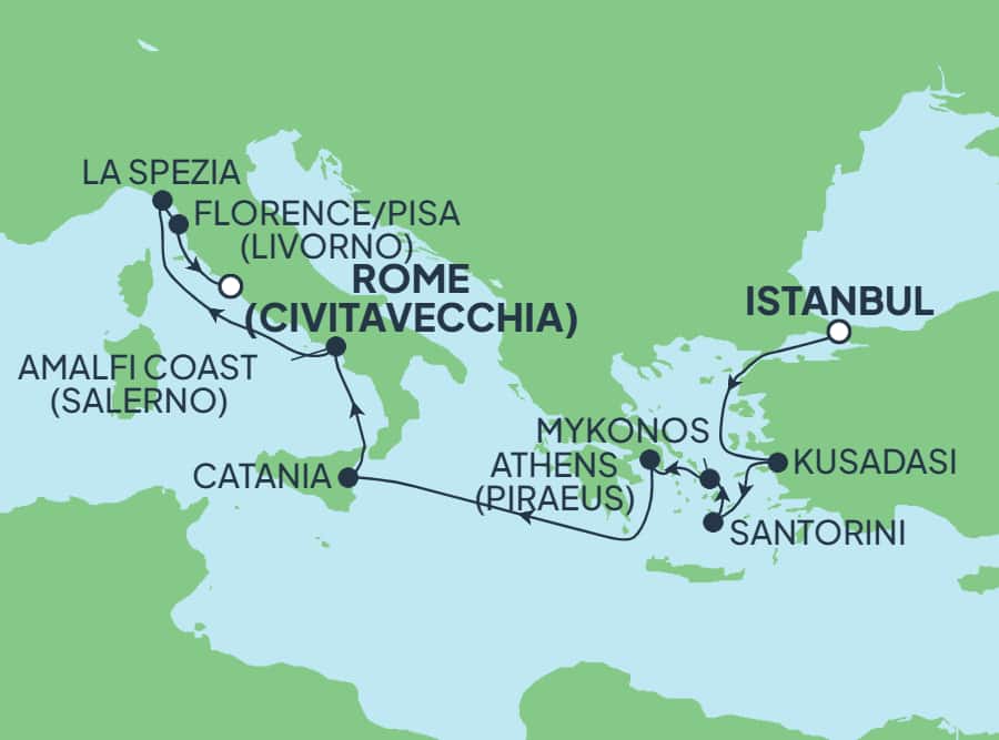 Viaja a bordo de en uno de nuestros barcos más nuevos e innovadores, el Norwegian Viva®, para vivir un crucero inolvidable por el Mediterráneo. Conoce la vida rural fuera de Kusadasi con nuestro tour Visión local, en donde pasarás el día en un pequeño pueblo e interactuarás con locales, colaborarás en la cosecha de cultivos y degustarás la cocina turca tradicional. Disfruta de un corto viaje en ferry desde Miconos a la isla de Delos, un sitio declarado Patrimonio de la Humanidad por la UNESCO y cuna mitológica de Apolo y Artemisa, y visita algunas de las ruinas antiguas mejor conservadas. En Atenas, siéntete como un dios o una diosa de la mitología griega mientras exploras el Partenón y otros lugares históricos fascinantes. Viaja desde Catania hasta el paisaje sobrenatural que rodea al Etna, disfruta de las vistas panorámicas desde su cima y descubre el volcán activo más grande de Europa.