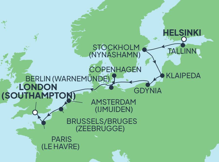 Embárcate en un viaje al norte de Europa, una tierra de rica historia y belleza impresionante, a bordo del Norwegian Prima®." Pasea por las calles adoquinadas de Klaipėda y su encanto de inspiración alemana, o toma el ferry hasta las espectaculares dunas de arena del Istmo de Curlandia. Entierra los dedos de los pies en las doradas playas de Warnemünde y luego saborea el manjar favorito de la costa: el Fischbrötchen. Explora la impresionante costa de Normandía y pasea por las playas históricas que bordean el Canal de la Mancha, en Le Havre.