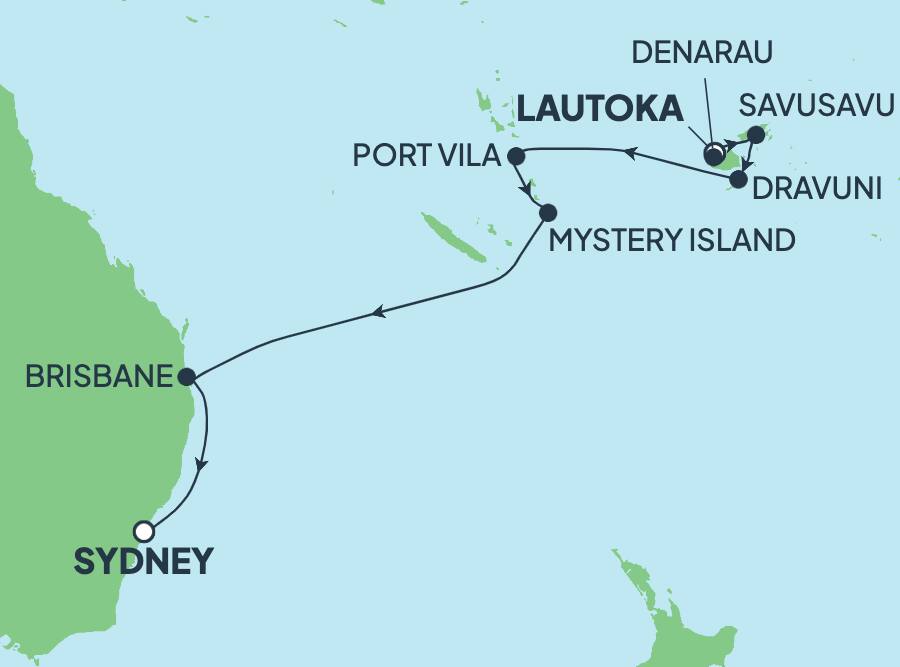 Embárcate en un viaje de 11 días desde Lautoka, la "ciudad del azúcar" de Fiyi, donde exuberantes islas pueblan el horizonte. Descubre un paraíso oculto de aguas termales volcánicas y coloridos arrecifes de coral en Savusavu, Fiyi. Sumérgete en la cultura o bucea en el mar azul profundo para disfrutar de vistas inolvidables. A continuación, en Port Vila (Vanuatu), recorre las cascadas de Mele o explora los vestigios de la Segunda Guerra Mundial mientras conoces las vibrantes tradiciones de la isla. El viaje termina en Sídney, Australia, donde el encanto urbano se combina con la belleza natural. Pasea por los jardines botánicos, admira la famosa Ópera de Sídney y mucho más.