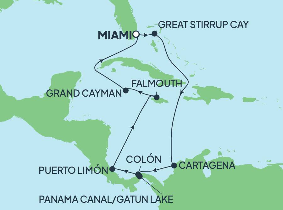 Descubre la vibrante belleza del Caribe y América Central en unas soleadas vacaciones de 11 días. Bebe un trago helado y relájate en tu cabaña privada en la playa en Great Stirrup Cay, nuestro paraíso tropical justo para ti. En Colón, maravíllate con la impresionante ingeniería del icónico Canal de Panamá mientras exploras selvas tropicales repletas de flora y fauna. Observa el arte local en los mercados de artesanías o haz un tour en barco por las ocultas vías fluviales del canal. Por último, en George Town (Islas Caimán), siente la suave arena de la playa de Seven Mile Beach o practica buceo de superficie en aguas turquesas repletas de peces de colores.
