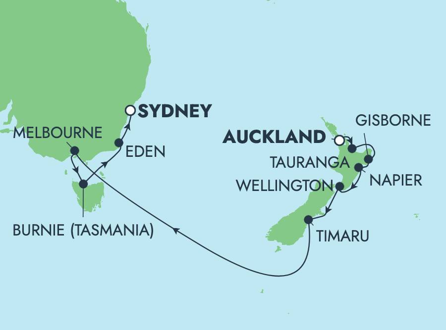 Experimenta paisajes increíbles, una vida silvestre diversa y las culturas ricas de Australia y Nueva Zelanda con Norwegian. En Gisborne, disfruta de una lección de surf en el mar o descubre por qué la ciudad es conocida como la "Capital del Chardonnay de Nueva Zelanda" saboreando productos de bodegas boutique locales. Descubre por qué Napier se apoda "la capital de arte decó del mundo" mientras caminas por sus encantadoras calles y arquitectura única. Melbourne tiene la combinación ideal de vida urbana vibrante rodeada de paisajes extraordinarios y fauna diversa, donde podrás darte un gusto gastronómico y visitar bodegas locales o pasar un rato con koalas y canguros irresistiblemente adorables. En Burnie, conoce la famosa vida silvestre y los jardines de Tasmania al visitar Wing's Farm Park, en donde podrás conocer los demonios de Tasmania, canguros y más antes de recorrer el increíble Emu Valley Rhododendron Garden que incluye más de 22,000 rododendros.