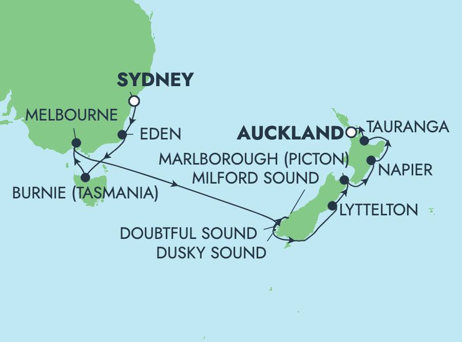Embárcate en un inolvidable crucero de 12 días desde Sídney hasta Auckland, en el que explorarás los maravillosos paisajes de Australia y Nueva Zelanda. En Eden, descubre la fascinante historia de la caza de ballenas en el Killer Whale Museum (Museo de la Orca) o embárcate en una emocionante aventura para observar la vida silvestre de la zona costera. Disfruta de los vibrantes callejones, restaurantes de primera clase y los tranquilos Jardines Botánicos Reales de Melbourne antes de seguir tu camino. En Lyttleton, visita el fascinante Museo Canterbury o prueba cómo es la vida en el continente más helado en el Centro Antártico. Por último, Tauranga te invita a visitar las maravillas geotérmicas de Rotorua, donde te sentirás cautivado por sus géiseres y fuentes termales.