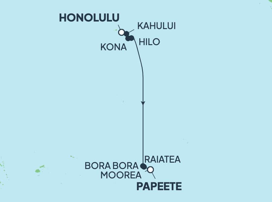 Deléitate con la impresionante belleza del Pacífico Sur y Hawái en este crucero de 12 días desde Honolulu hasta Papeete. Zarpa desde Honolulu, la ciudad más grande y quizás la más pintoresca de Hawái. Sumérgete en culturas vibrantes con aguas cristalinas y paisajes tropicales como telón de fondo. Responde a la llamada de Raiatea con una visita al marae de Taputapuatea, declarado Patrimonio de la Humanidad por la UNESCO, que atesora vestigios de la antigua historia polinesia. Disfruta de las aguas turquesas de Bora Bora durante un safari de buceo en la superficie o una emocionante aventura en moto acuática.