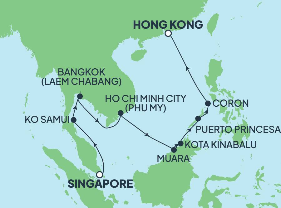 Parte en un crucero de 13 días para recordar desde Singapur a Hong Kong con Norwegian. Desde Laem Chabang contempla los gloriosos palacios y templos dorados de Bangkok, las barcas reales y el Templo de Buda Esmeralda. Pasea por la bulliciosa ciudad con mucha diversidad étnica de Kota Kinabalu en Malasia con su arquitectura única de gran altura. O aventúrate dentro del interior para descubrir plantas y orquídeas exóticas. Y disfruta de la historia, la naturaleza, la buena comida y las relajantes playas de Puerto Princesa, Filipinas.