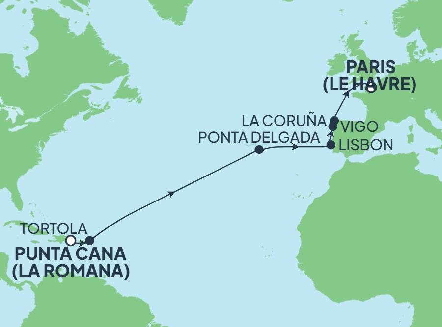 Embárcate en un increíble viaje transatlántico desde República Dominicana hasta Francia a bordo del Norwegian Sky®. Explora las hermosas playas de Tórtola, Islas Vírgenes Británicas. Relájate en las termas naturales de Ponta Delgada y déjate cautivar por los pintorescos paisajes que verás durante tu recorrido por la campiña. Luego, viaja desde La Coruña a Santiago de Compostela, ciudad declarada Patrimonio de la Humanidad por la UNESCO, y contempla la impresionante arquitectura de la famosa catedral de la Plaza del Obradoiro, explora lo mejor de la Ciudad Vieja y saborea la gastronomía local.