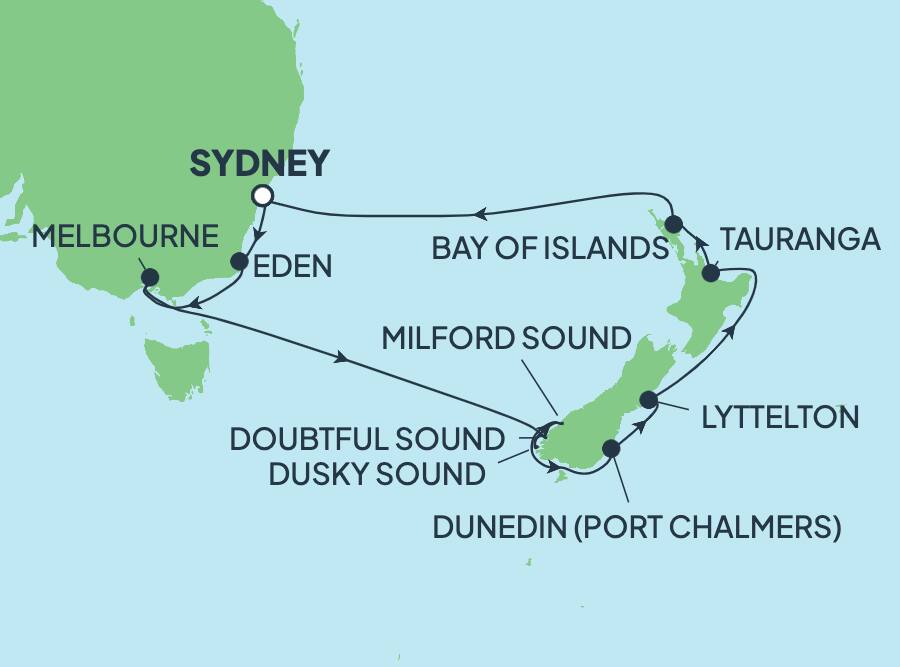 Emprende unas lujosas vacaciones de 14 días, y disfruta de dos semanas completas en las que tendrás más tiempo para relajarte, explorar y sumergirte en destinos de ensueño. Comienza en Sídney y luego zarpa hacia Melbourne, una ciudad llena de cultura y encanto. Pasea por sus callejones cargados de arte, descubre boutiques exclusivas o encuentra serenidad en los jardines botánicos reales. Cruza el mar de Tasmania y llega a Dunedin (Nueva Zelanda), una ciudad en la que conviven la herencia escocesa y una belleza natural salvaje. Recorre los pasillos del histórico castillo de Larnach o explora la península de Otago, hábitat de especies salvajes poco comunes y vistas asombrosas. En Tauranga, disfruta de la magia costera de Nueva Zelanda mientras paseas por playas doradas o dirígete a Rotorua para deleitarte con sus maravillas geotérmicas.`
