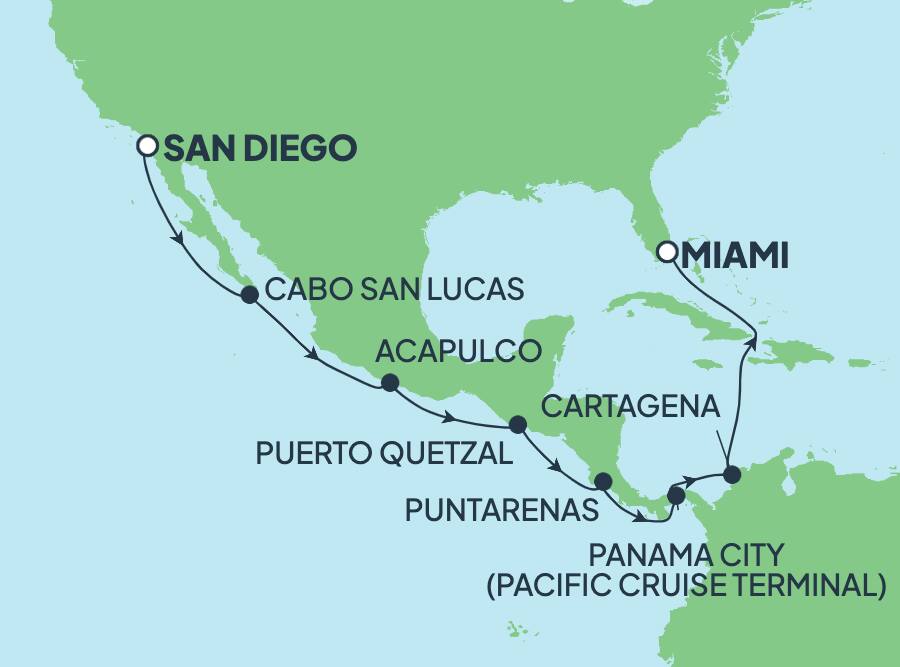 Recorre el increíble Canal de Panamá con Norwegian con un itinerario de 15 días, desde San Diego a Miami a bordo del Norwegian Jade®. Viaja a la joya de la península de Baja, Cabo San Lucas, famosa por la pesca deportiva de primer nivel, al igual que sus centros turísticos de altísima calidad. En Puerto Quetzal, aventúrate hacia Antigua, una excursión de 90 minutos en la que las fachadas coloniales del siglo 17 atraen a los visitantes y la historia guatemalteca cobra vida. Desde la ciudad de Panamá, visita el Canal de Panamá, famoso en todo el mundo, una auténtica maravilla de la ingeniería moderna. Sube a las murallas de Cartagena para disfrutar de vistas inolvidables del puerto.