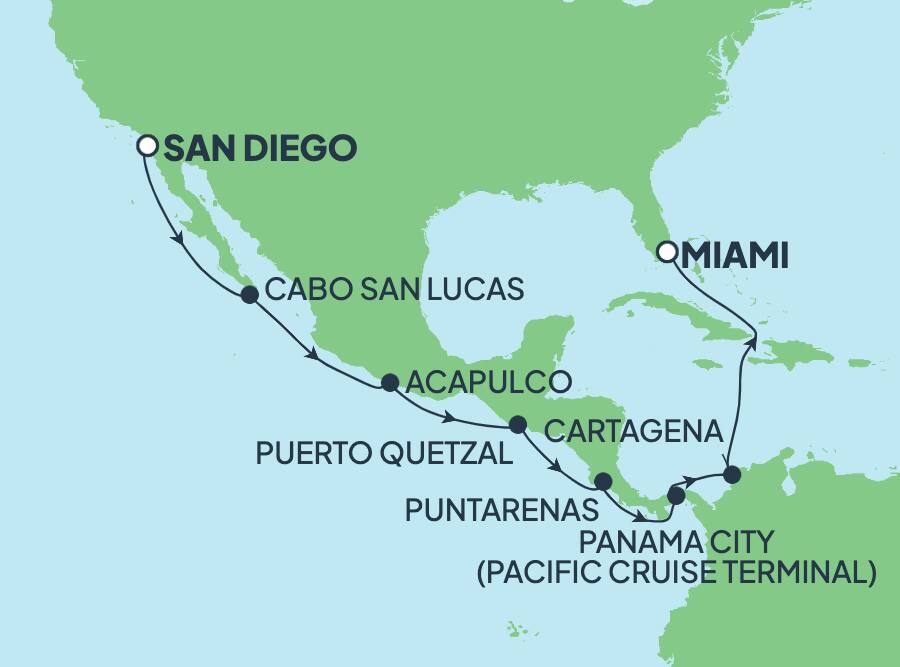 Navega por el increíble Canal de Panamá con Norwegian en un itinerario de 15 días desde Miami hasta San Diego a bordo del Norwegian Star®. Viaja hacia la joya de la península de Baja California, Cabo San Lucas, famoso por su pesca deportiva de primera clase, así como por sus exclusivos resorts. En Puerto Quetzal, aventúrate hacia Antigua, una excursión de 90 minutos en la que las fachadas coloniales del siglo 17 atraen a los visitantes y la historia guatemalteca cobra vida. Desde la ciudad de Panamá, visita el Canal de Panamá, famoso en todo el mundo, una auténtica maravilla de la ingeniería moderna. Sube a las murallas de Cartagena para disfrutar de vistas inolvidables del puerto.