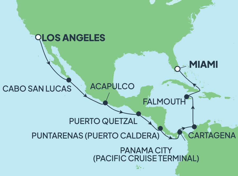 Navega con Norwegian de Los Ángeles a Miami con un espectacular itinerario de 16 días por el Canal de Panamá. Viaja a la joya de la península de Baja California, Cabo San Lucas, famoso por su pesca deportiva de primera clase y sus exclusivos resorts. En Ciudad de Panamá, visita el famoso Canal de Panamá o siéntete como en otro mundo mientras te relajas en una playa virgen o haces senderismo entre exuberantes selvas tropicales. Y en Falmouth, Jamaica, pasa de pasear por sus playas de arena blanca a contemplar la arquitectura georgiana del siglo 19.