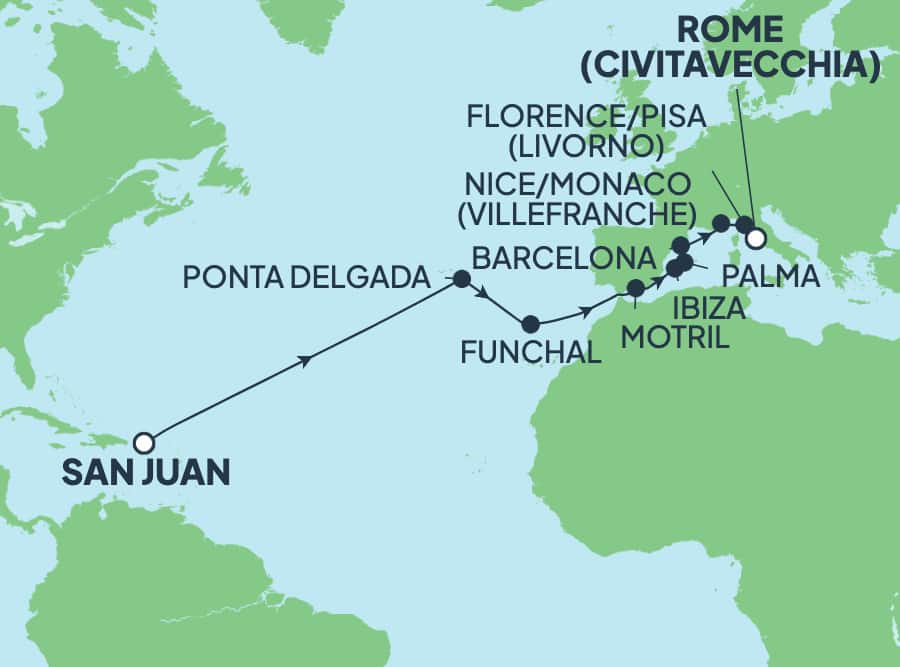 Embárcate en las vacaciones de tu vida durante este viaje transatlántico a bordo del Norwegian Prima®, uno de nuestros barcos más nuevos e innovadores. Relájate en las termas naturales de Ponta Delgada y déjate cautivar por los pintorescos paisajes que verás durante tu recorrido por la campiña. En Lisboa, visita la encantadora ciudad de Óbidos fundada en el siglo 13 y descubre por qué se la considera una de las aldeas más románticas del país, mientras visitas el castillo medieval y recorres sus angostas calles de adoquines. Explora la colorida ciudad de Barcelona, donde visitarás la Sagrada Familia, diseñada por el "arquitecto de Dios", Antoni Gaudí. Enclavada en la costa oeste de la Toscana, Livorno ofrece los mariscos más frescos, imponentes fuertes y espléndidas vistas costeras, con una gran variedad de cafeterías y boutiques que esperan ser descubiertas.