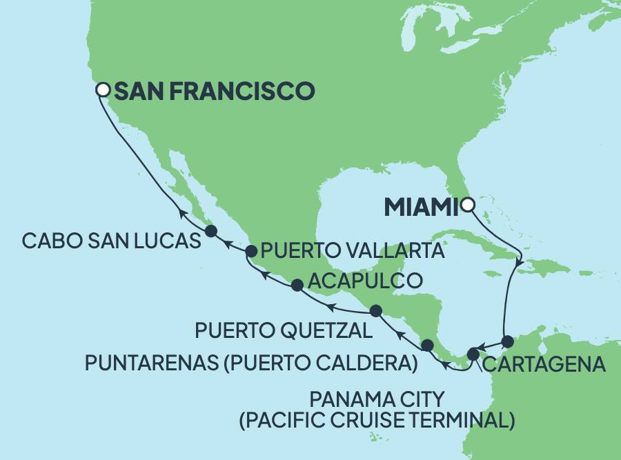 Experimenta una variedad de culturas, cocinas y costas en un viaje de 18 días a bordo del Norwegian Encore. Compra artículos de piel locales por las calles empedradas de Cartagena o recorre el Fuerte San Felipe de Barajas, del siglo 17, el fuerte español más importante del nuevo mundo. Hábitat natural de perezosos de tres dedos, tamarinos y monos aulladores, el Parque Nacional Soberanía es una visita obligada para los amantes de la naturaleza en la Ciudad de Panamá, donde te quedarás a dormir una noche. En Cabo San Lucas, vive lo último en aventura todoterreno en un ATV por los cañones aislados y los espectaculares paisajes desérticos de la Baja. Con noche en San Francisco, tendrás mucho tiempo para visitar Muir Woods, hogar de algunos de los árboles más altos y antiguos del mundo, o para dar un paseo escénico por los viñedos de Sonoma.
