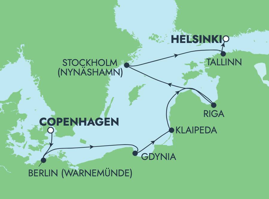 Embárcate en un inolvidable viaje de 7 días por el mar Báltico, comenzando en la vibrante ciudad de Copenhague y concluyendo en las encantadoras calles de Helsinki. En el camino, descubrirás aspectos destacados de la historia, la cultura y los paisajes del norte de Europa en cada etapa del recorrido. En Warnemünde, Alemania, disfruta de un recorrido panorámico hasta Berlín para explorar lugares emblemáticos como la Puerta de Brandeburgo y el Muro de Berlín. En Klaipeda, Lituania, sumérgete en una clase práctica de cocina, saborea una sopa de remolacha rosada y prueba cervezas locales después de un recorrido por la histórica cervecería Svyturys. En Nynäshamn, Suecia, sumérgete en la historia real de Estocolmo en el Palacio Real o deléitate con las delicias tradicionales suecas en un recorrido culinario.