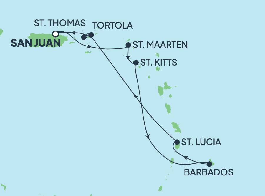Zarpa desde San Juan, una ciudad llena de colores vibrantes y ritmos isleños, en un viaje de 7 días por el Caribe. Desde Philipsburg, navega en kayak por Simpson Bay Lagoon en un tour guiado que te permitirá ver árboles del manglar, iguanas y una atractiva fauna marina. Continúa hacia Bridgetown, Barbados, un lugar lleno de ritmo y color donde podrás ver el area histórica de la Guarnición, disfrutar de un buen ron local o relajarte en playas doradas bañadas por olas turquesas. Disfruta de las vistas panorámicas a lo largo de la autopista Sir Frances Drake de Tórtola y descubre las pintorescas villas.