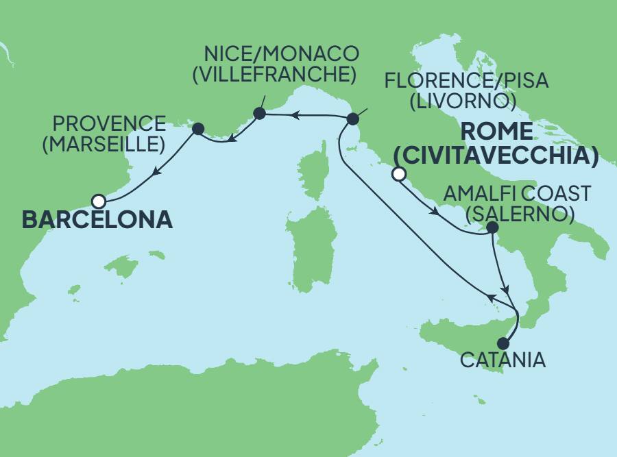 Enamórate de los paisajes espectaculares y la riqueza cultural de Europa. Ubicada en la costa oeste de la Toscana, la encantadora Livorno ofrece a sus visitantes los mariscos más frescos, espectaculares fortalezas y espléndidos paisajes costeros con amplios cafés y boutiques que esperan tu visita. Piérdete por las calles adoquinadas, los edificios coloridos y las increíbles vistas de Villefranche-sur-Mer, una pintoresca ciudad ubicada en la Riviera Francesa, o reposa en una de las idílicas playas cercanas.