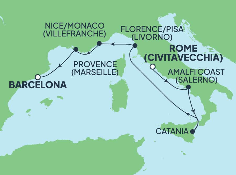 Enamórate de los paisajes espectaculares y la riqueza cultural de Europa. Ubicada en la costa oeste de la Toscana, la encantadora Livorno ofrece a sus visitantes los mariscos más frescos, espectaculares fortalezas y espléndidos paisajes costeros con amplios cafés y boutiques que esperan tu visita. Piérdete por las calles adoquinadas, los edificios coloridos y las increíbles vistas de Villefranche-sur-Mer, una pintoresca ciudad ubicada en la Riviera Francesa, o reposa en una de las idílicas playas cercanas.