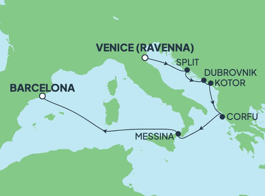 Descubre los clásicos, la gastronomía y la cultura del Mediterráneo en este viaje de 7 días desde Ravena, en Italia, hasta Barcelona. Recorre los paseos marítimos repletos de cafés de Split, en la costa oriental del Adriático. Pasea por las plazas y tiendas del casco antiguo de Kotor o relájate en una de las playas cercanas.