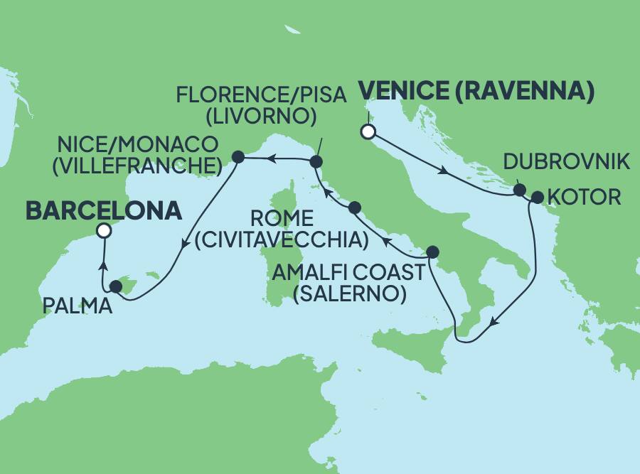 Disfruta al máximo tus vacaciones de verano en Europa a bordo del Norwegian Viva®. Los fanáticos de la serie Game of Thrones podrán disfrutar de un tour por la Vieja Ciudad de Dubrovnik, donde se ubican varios de los lugares históricos que aparecen en la exitosa serie de televisión. Desde Civitavecchia, explora las famosas ruinas antiguas y las obras de arte de Roma, desde la deslumbrante Capilla Sixtina hasta la exquisita Fontana de Trevi. Palamós es la puerta de entrada a la región de la Costa Brava, famosa por sus espectaculares paisajes escarpados, pueblos pintorescos y deliciosa comida.