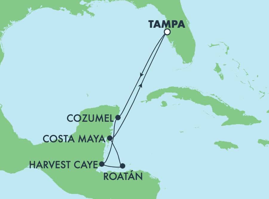 Parte de Tampa en un crucero emocionante y vive una aventura inolvidable en el Caribe. Aventúrate a la Península de Yucatán y disfruta la mejor pesca y buceo en la encantadora Cozumel. Disfruta al máximo todos los deportes acuáticos, actividades de playa y aventuras en la isla principal del Caribe; además, puedes hacer tirolesa y disfrutar Harvest Cay desde arriba, ¿alguien se atreve? Y Costa Maya es el lugar ideal para recorrer ruinas mayas, relajarte y divertirte en playas bellísimas y hacer buceo de superficie en el segundo arrecife de coral más grande del mundo.
