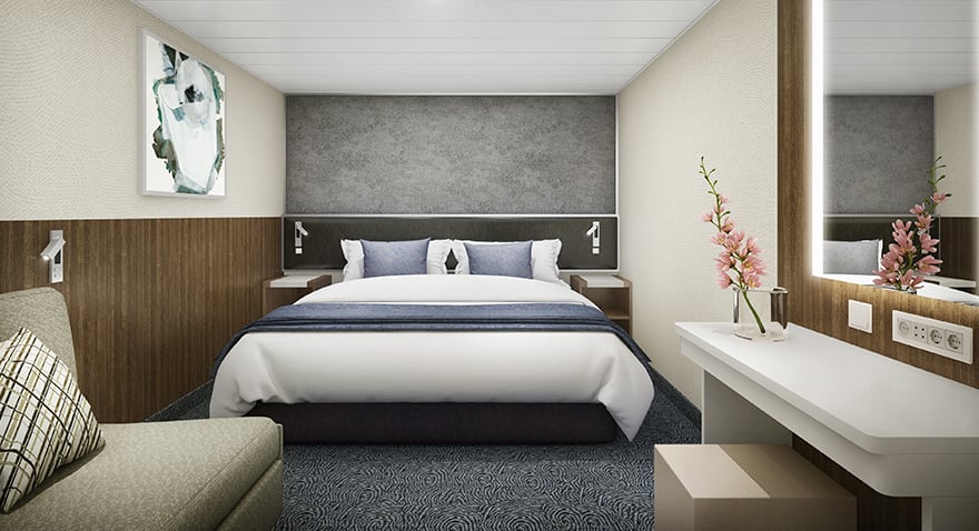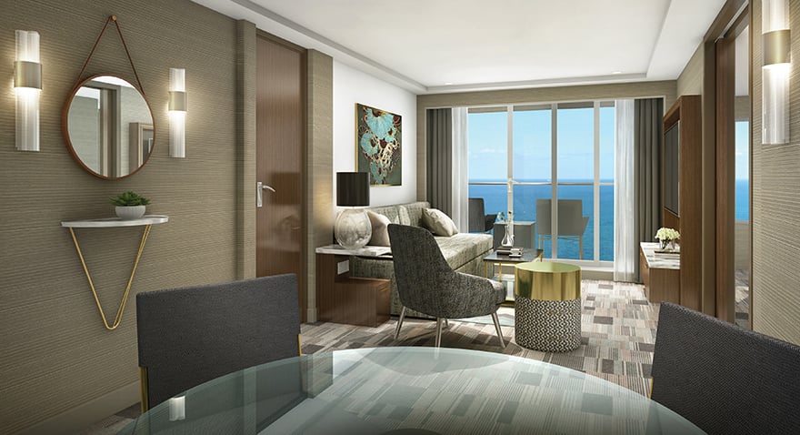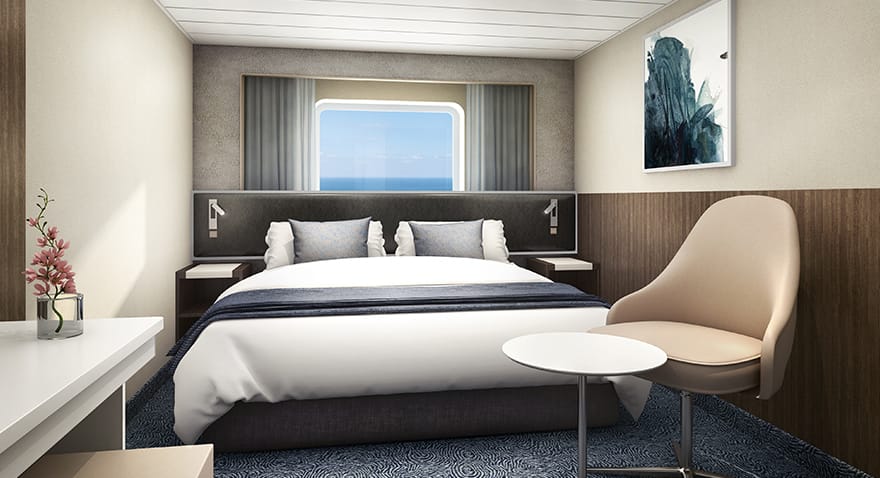 Deléitate con la tranquilidad y amplitud en alta mar con nuestras impresionantes suites lujosas e innovadoras que ofrecen solo el mejor equipamiento por donde las mires. Los ventanales del piso al techo en nuestros camarotes con balcón privado son perfectos para los amantes del sol y observadores de estrellas. Nuestros camarotes con vista al mar y camarotes interiores son cómodos y están bien decorados, donde podrás recostarte al final del día o descansar por las mañanas.
