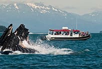 Discover the wonders of Mendenhall Glacier at its visitor center and cruise a purpose-built vessel through waters where humpback whales and other marine creatures are commonly spotted. The glacier is the only one in Southeast Alaska accessible by road, just one of the facts you will learn while browsing the Mendenhall Glacier Visitor Center. The glacier is 13 miles long and is part of the massive Juneau Icefield, a remnant of the last ice age. Time permitting, you can stroll the glacier-view path at the center or watch salmon in a nearby stream before driving on to Auke Bay. Here, you will embark a catamaran specially designed for wildlife viewing. Humpback whales are the star attractions in these waters, but you may also spot orcas, sea lions and bald eagles. To enhance the experience, the vessel is outfitted with a hydrophone that may allow you to hear the sounds of the whales below. Throughout the cruise, your onboard naturalist will explain the behavior and habitat of the humpback whale.